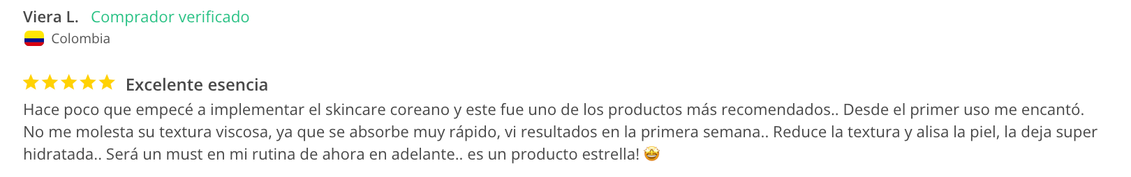 Con 96.3% de mucina de caracol filtrada, esta esencia ligera hidrata, repara y deja la piel con un brillo natural.